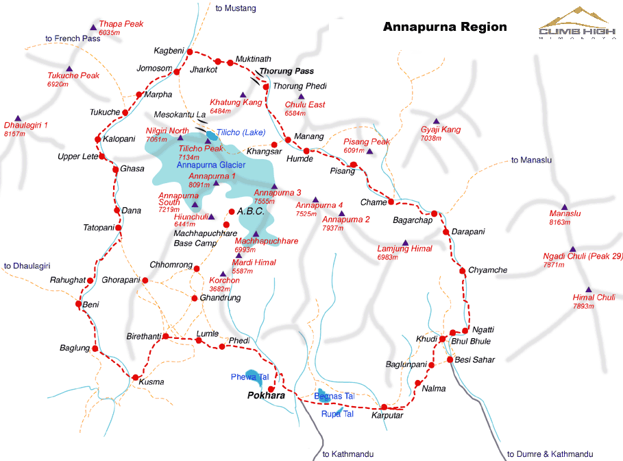 The walk around the Annapurna Circuit is a classic trip right around the huge massif of mountains that make up the Annapurna group. Though it has some steep climbs, it is not difficult and the views along the way are spectacular. It takes a minimum of 18 days to trek around the entire Annapurna massif, visiting the Tibet – like country on the northern slopes of the Himalaya and the dramatic Kali Ghandaki gorge. The trek takes you over Thorung la with its traditional chorten, prayer flags and stone cairns at an elevation of 5,416m. The views from the trail and from the pass itself are outstanding high Himalayan scenes.